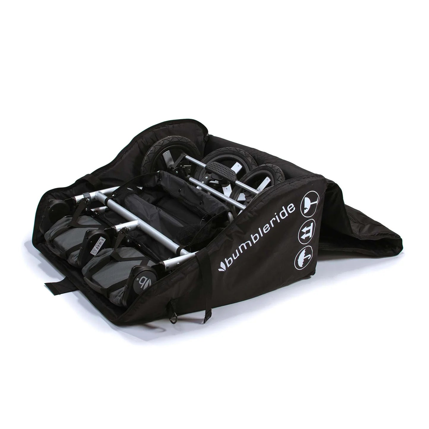 The Bumbleride double stroller travel bag will ensure Indie Twin’s safe and clean arrival to your destination. There’s no need to remove stroller wheels thanks to dual-zippered sides and a large center opening, making packing up or unloading quick and easy. An inner security belt, 3 exposed luggage wheels, and a footed base make for quick maneuvering through tight spaces or upright stow.