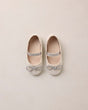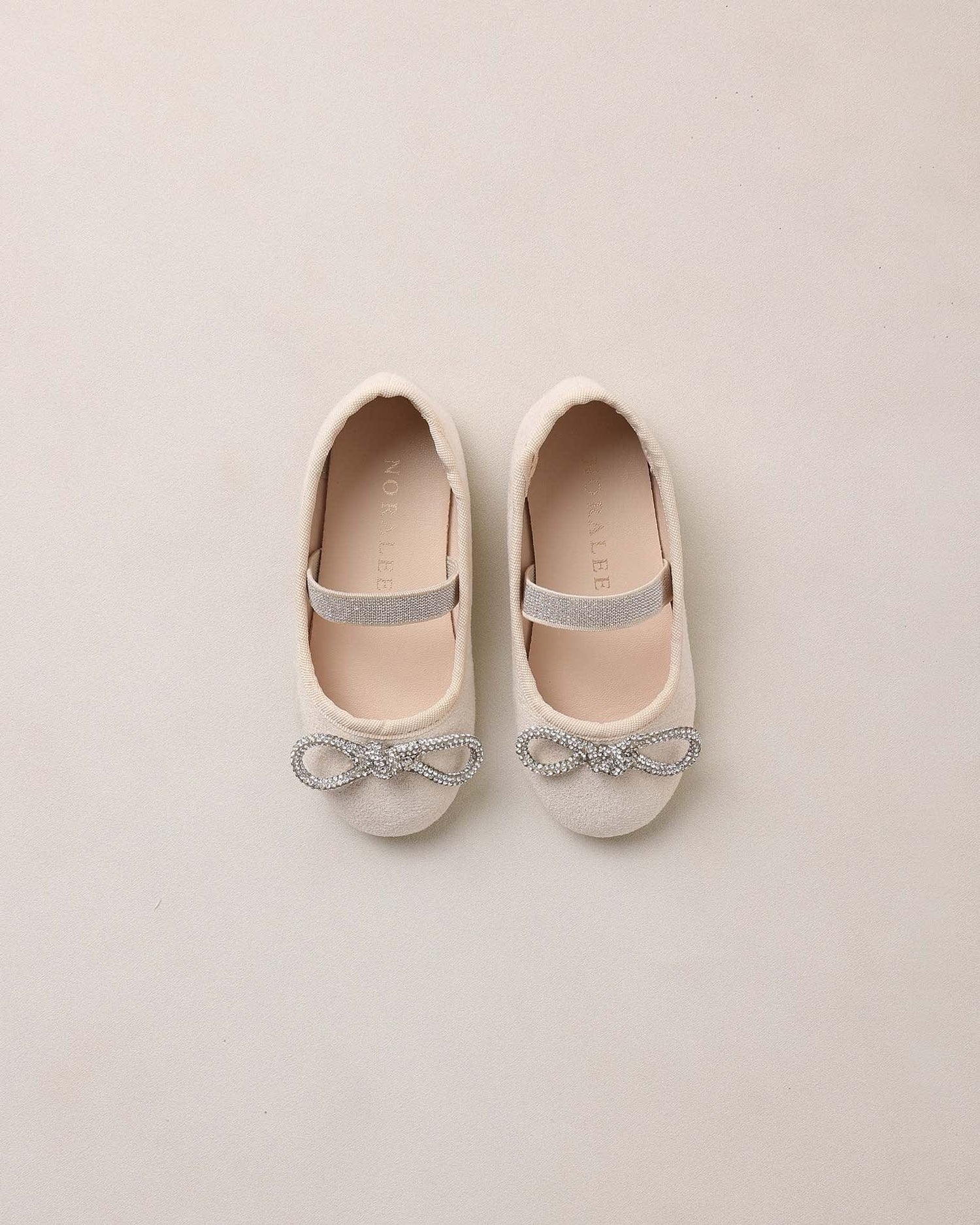Pair any dress or tutu with these shimmery cream Ballet Flats! Featuring elastic straps and a charming tie bow on the front.