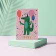 3 Crocodile number three age greetings card by Rumble Cards. Sweet third birthday card with gold foil details. Blank inside for your own message. Brown recycled envelope.