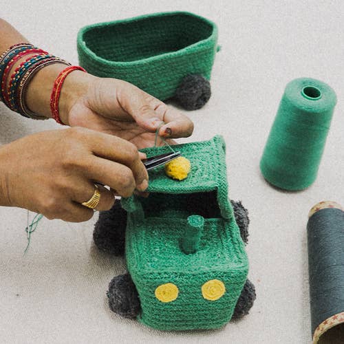 two-piece tractor basket, handcrafted from green cotton cords, is packed