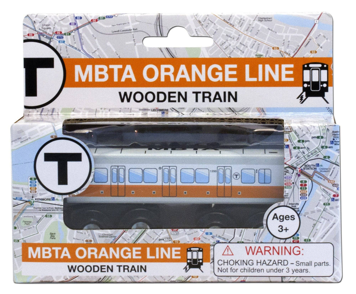 Boston MBTA (Massachusetts Bay Transportation Authority) Orange Line wooden subway car is ready to run from Forest Hills to Oak Grove. Subway car is manufactured of solid hardwood and comes individually packaged in box shown. Magnets on each end of the car allow it to be connected to others wooden toy trains.