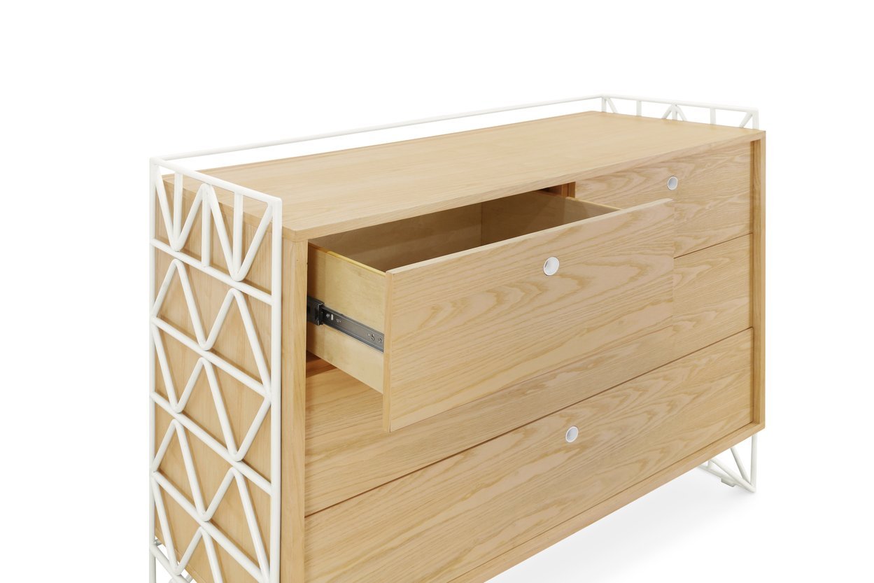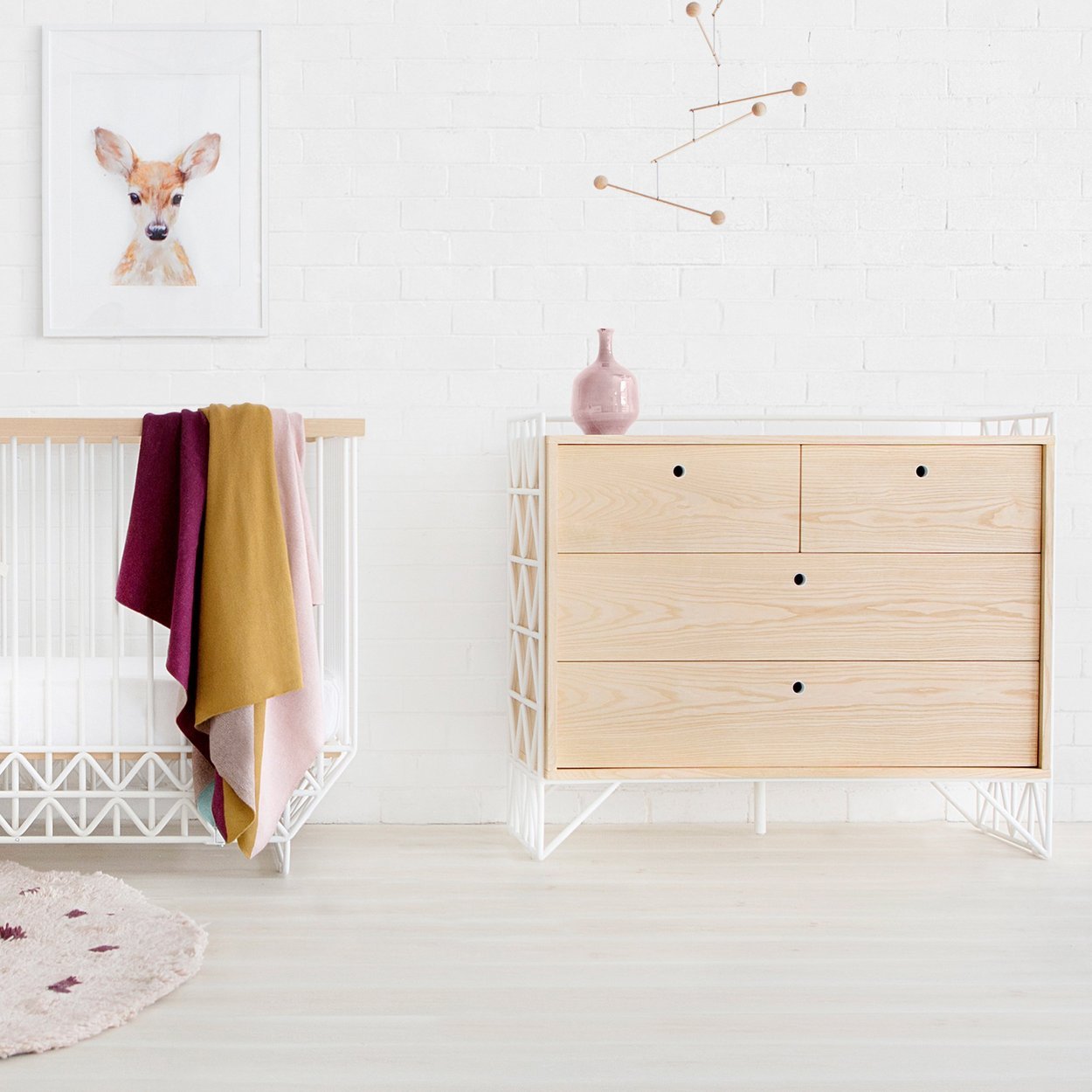 The perfect companion to your Mod Cot, the Mod Dresser is designed for great storage capacity and ample room on top for changing baby. Its sleek, modern and durable design combines ash wooden drawers with a stylish geometric bent-steel frame. Keep baby’s clothes and necessities organised in the smooth-opening drawers, while stop mechanisms prevent them from being pulled all the way out.