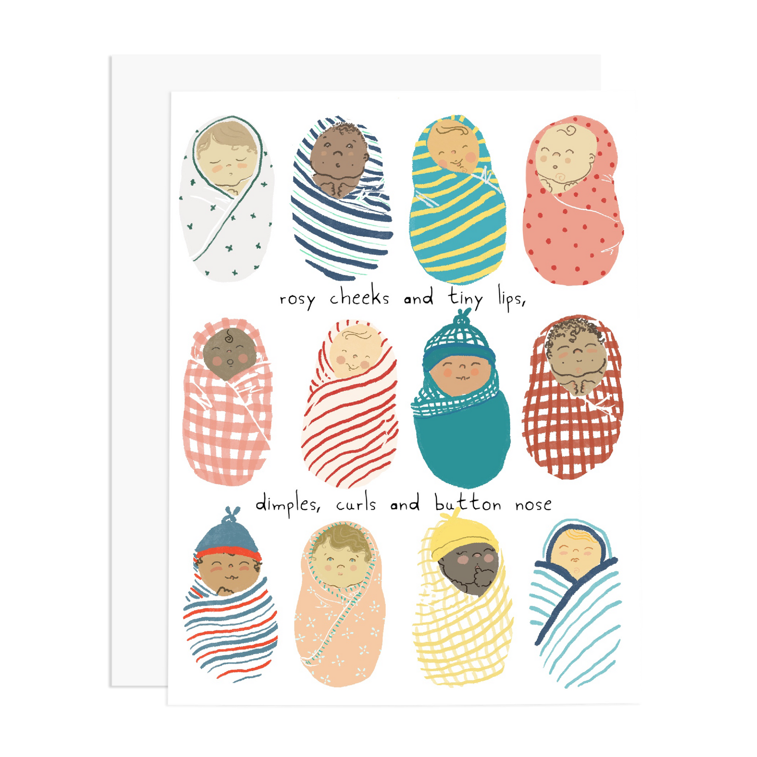 "Rosy Cheeks and Tiny Lips, Dimples, Curls and Button Nose" is the cutest card to send sweet wishes to a mom-to-be or a new baby.
