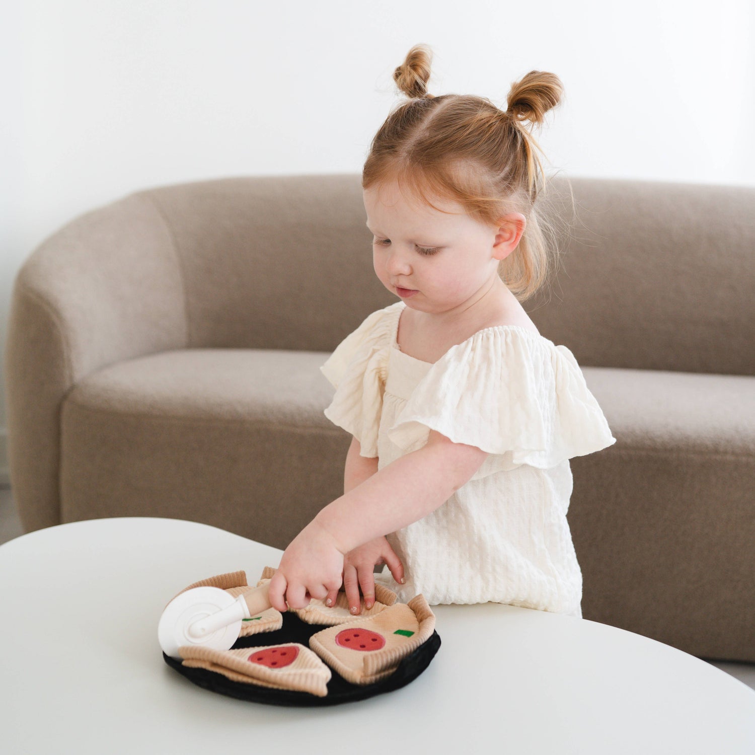 Get ready for hours of imaginative fun with the Slice & Serve Pizza Play Set! This adorable pretend play set is made for newborn up to 3 yrs old. Each pizza slice features multiple textures and a stimulating crinkly texture and sound for your little one to feel with their tiny fingers since birth! Then as they grow older, the set can be used to train motor skills and the concept of math without being too difficult.