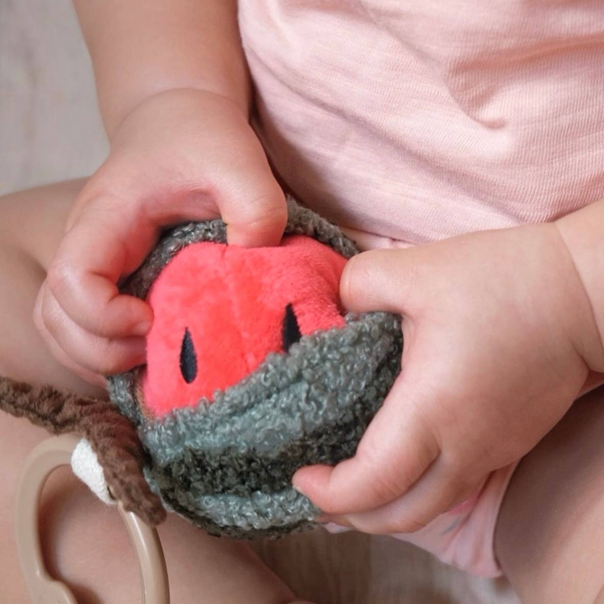 An attachment C ring comes with each watermelon rattle to attach it to strollers or play gyms.