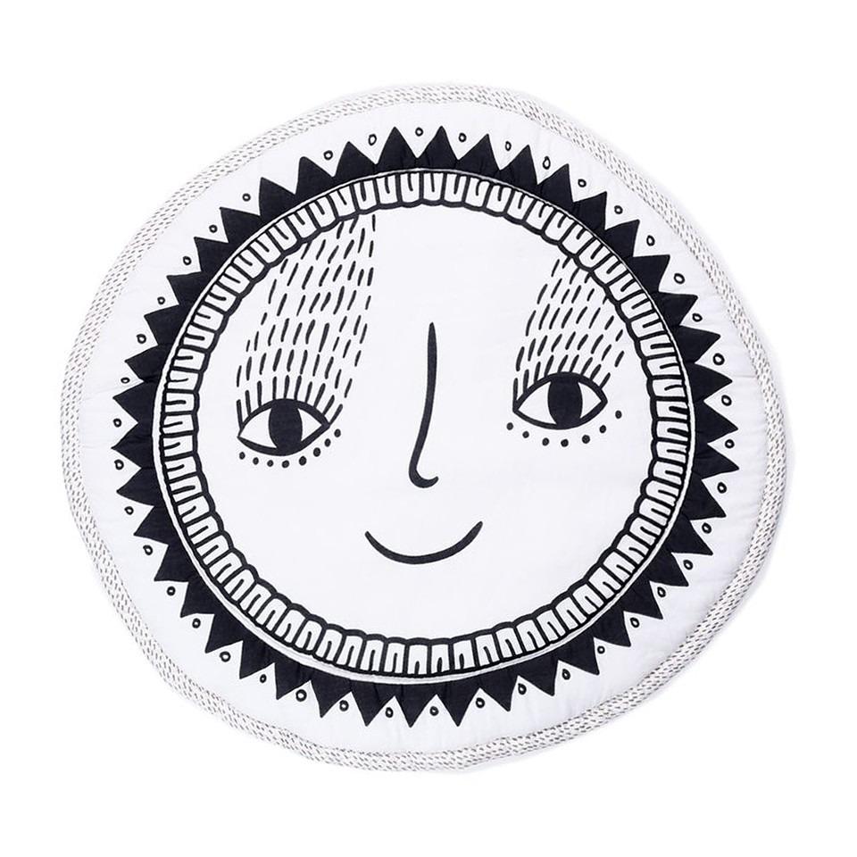 This reversible playmat features a sun on one side and stars on the other. Made in India using organic traditional fabrics. The outer fabric is a double layer of organic voile making it super soft and Poly-Fil makes it machine washable for convenience. Its high contrast graphics make it ideal as a playmat. The reversible two-sided pattern keeps it interesting for baby. Packaged in a drawstring fabric bag with tassel.